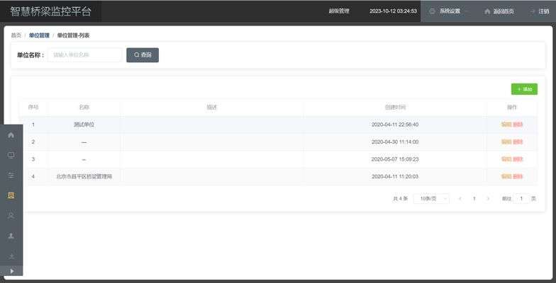 可以查看单位的名称,创建时间,查找单位的名称,添加单位,删除单位。可以有效的对单位进行管理