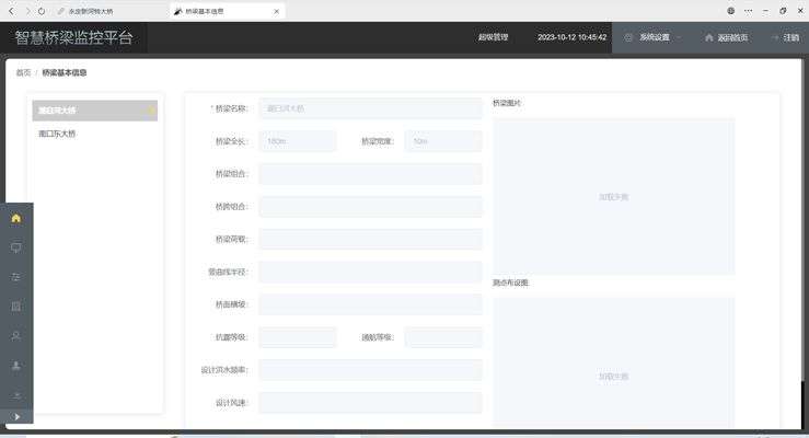 桥梁信息包括桥梁名称、桥梁全长、桥梁宽度、桥梁组合、桥跨组合、桥梁荷载、竖曲线半径、桥面横坡、抗震等级、通航等级、设计洪水频率、设计风速和桥梁图片以及测点布设图