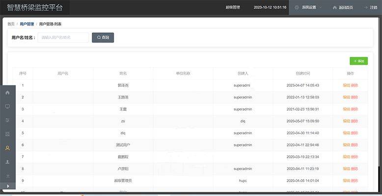可以查看用户名、姓名、单位名称,以及添加用户和删除用户